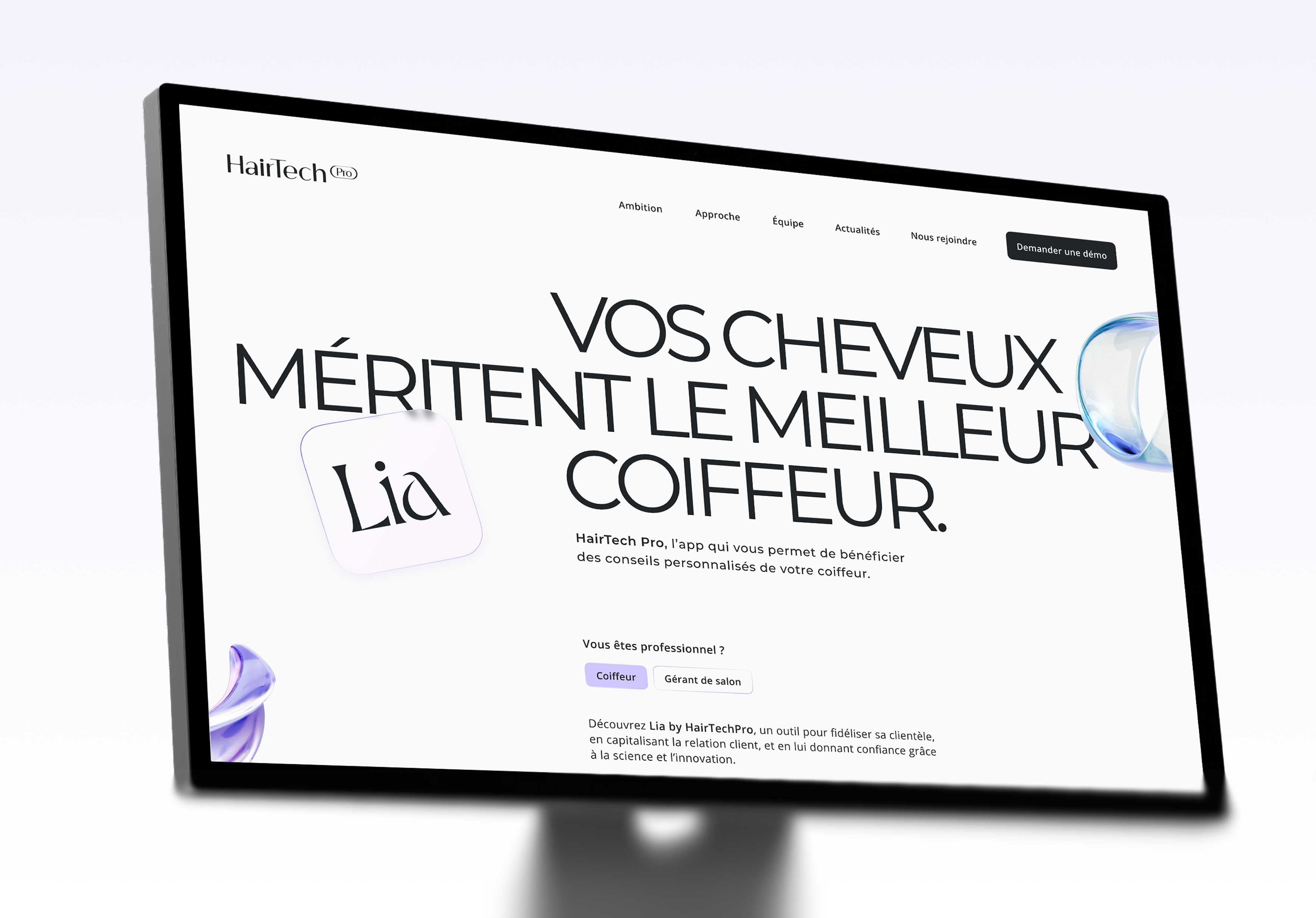 ✦ Nous avons d’abord accompagné HairTech Pro dans la création d’une identité visuelle complète, pensée pour durer et évoluer. À partir d’une phase d’exploration créative, nous avons conçu et sélectionné un univers graphique clair et distinctif, décliné aussi bien pour la marque HairTech Pro que pour son produit LIA by HairTech Pro.